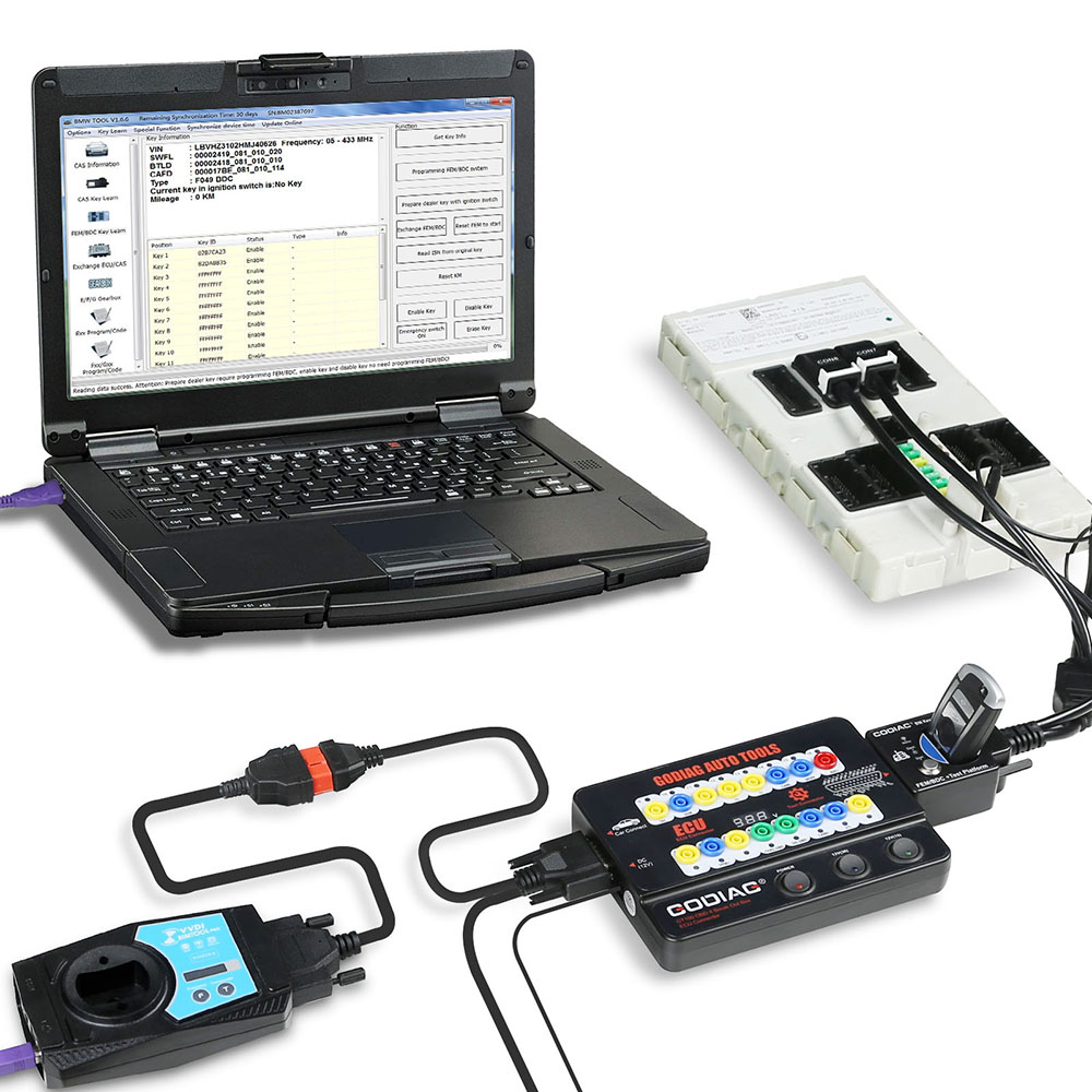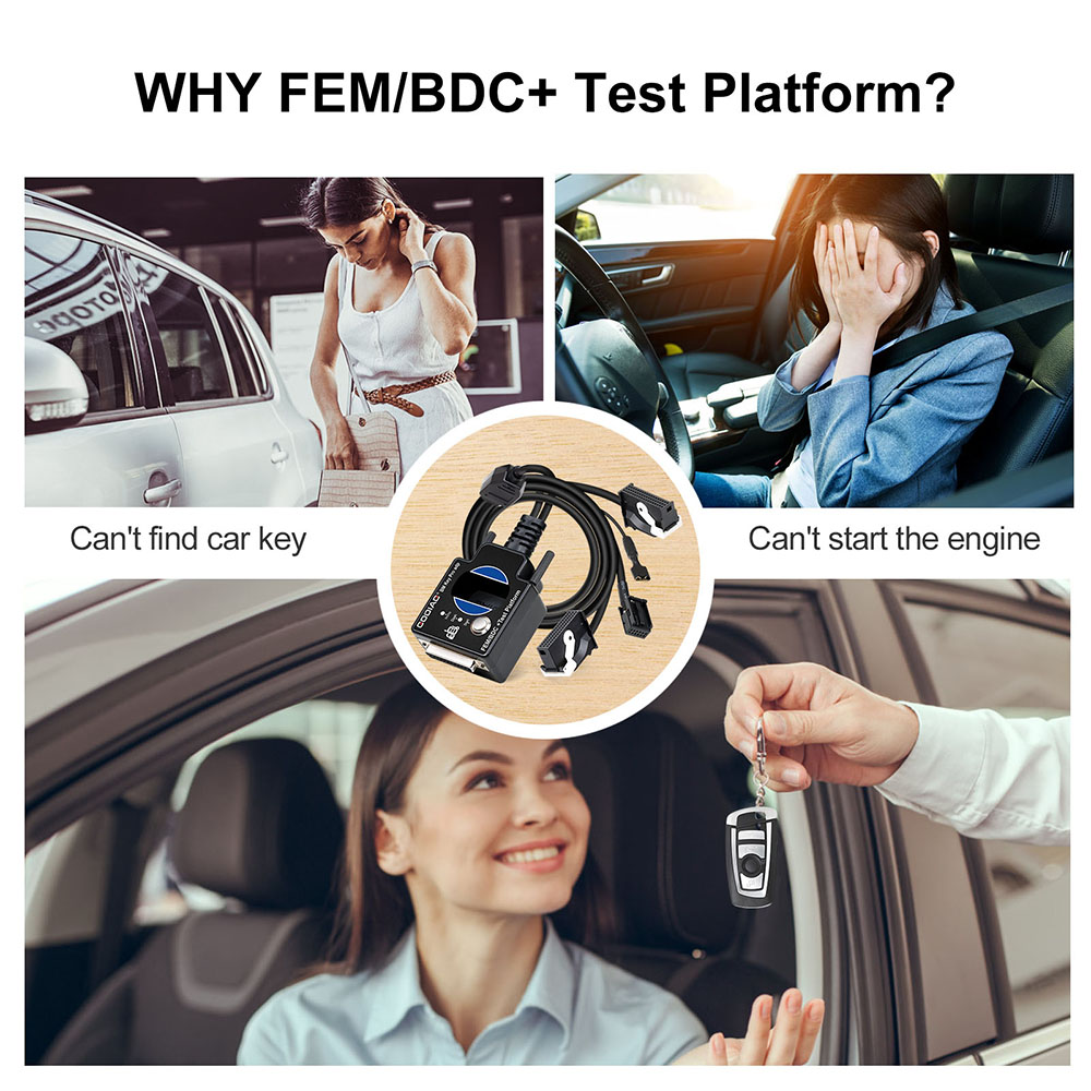 1. By working together with Godiag GT100 & xhorse vvdi 2 / bmw vvdi bim tool / Autel im608 etc, Godiag FEM / BDC test platform can program new key, can add new key and replace FEM / BDC ECU module.
