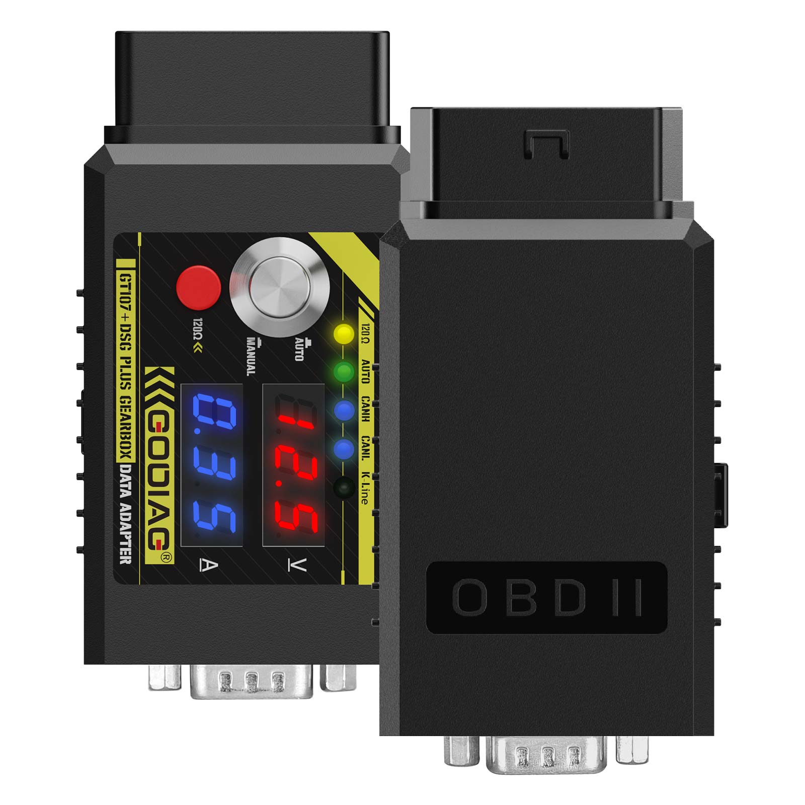 3.GODIAG GT107 + analog ignition switch is in “automatic” mode if the ignition switch is not pressed, the voltage and current data of the adapter displays 0V 0A, and it is in “manual” mode, if the ignition switch is pressed, the adapter displays the current working voltage of the power supply, and the current working current of gearbox ECU. (Note: please select the “automatic” or “manual” analog ignition mode, according to the mode required by the device for reading and writing data, )